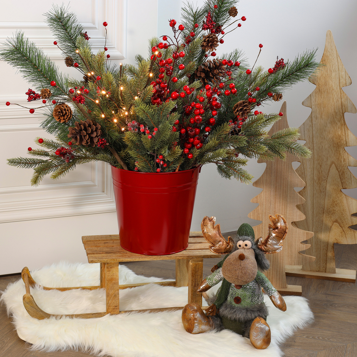 Композиция из еловых веток дополнена сочными красными шариками ягод и чешуйчатыми шишками, придающими ей объём и живость. Аккуратное металлическое кашпо-ведёрко играет здесь роль красочного акцента, который сделает Рождественский букет звездой праздничного интерьера. А дополнительный новогодний декор – пушистый меховой коврик, деревянные елочки в эко-стиле, смешной увалень Умберто, который оставил на время свою службу дверным стоппером, чтобы присоединиться к колоритной компании – обеспечат ощущение домашнего уюта.