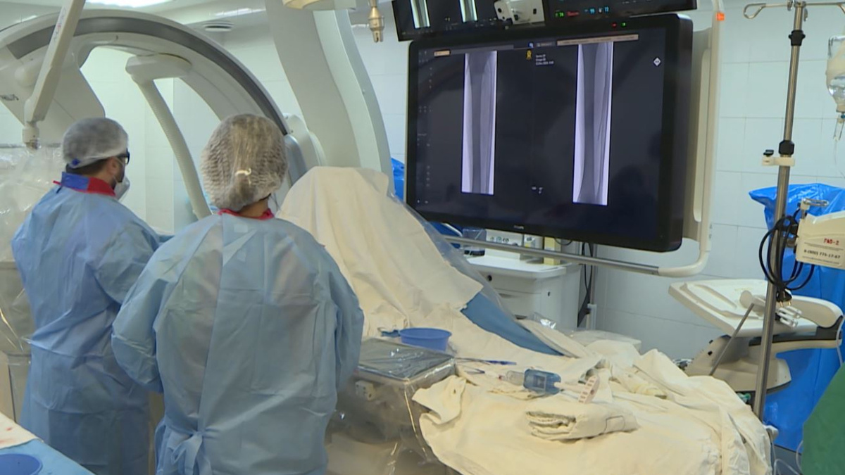 Врачи Сургутской окружной клинической больницы первыми в России выполнили высокотехнологичную операцию по удалению тромба с использованием новой ультразвуковой методики. Пациента спасли от ампутации ноги, сейчас он идет на поправку. Через небольшой прокол хирурги установили инфузионный и ультразвуковой катетеры в зону тромбоза. На экране артерии пациента как на ладони. В течение шести часов с помощью ультразвука и специального тромболитического препарата врачи прицельно разрушают опасные тромбы. «Двумя механизмами действия мы разрушаем тромбы, то есть с последующим лечением они исчезают в артерии. Посмотрели, убедились, что тромбы все растворились в подвздошной артерии, в бедренной артерии, и далее произвели операцию — дополнительно имплантировали два стента в подвздошную артерию», — рассказал Павел Кан, заведующий отделением рентгенохирургических методов диагностики и лечения Сургутской окружной клинической больницы. Для лечения тромбоза артерий нижних конечностей пациента хирурги исп