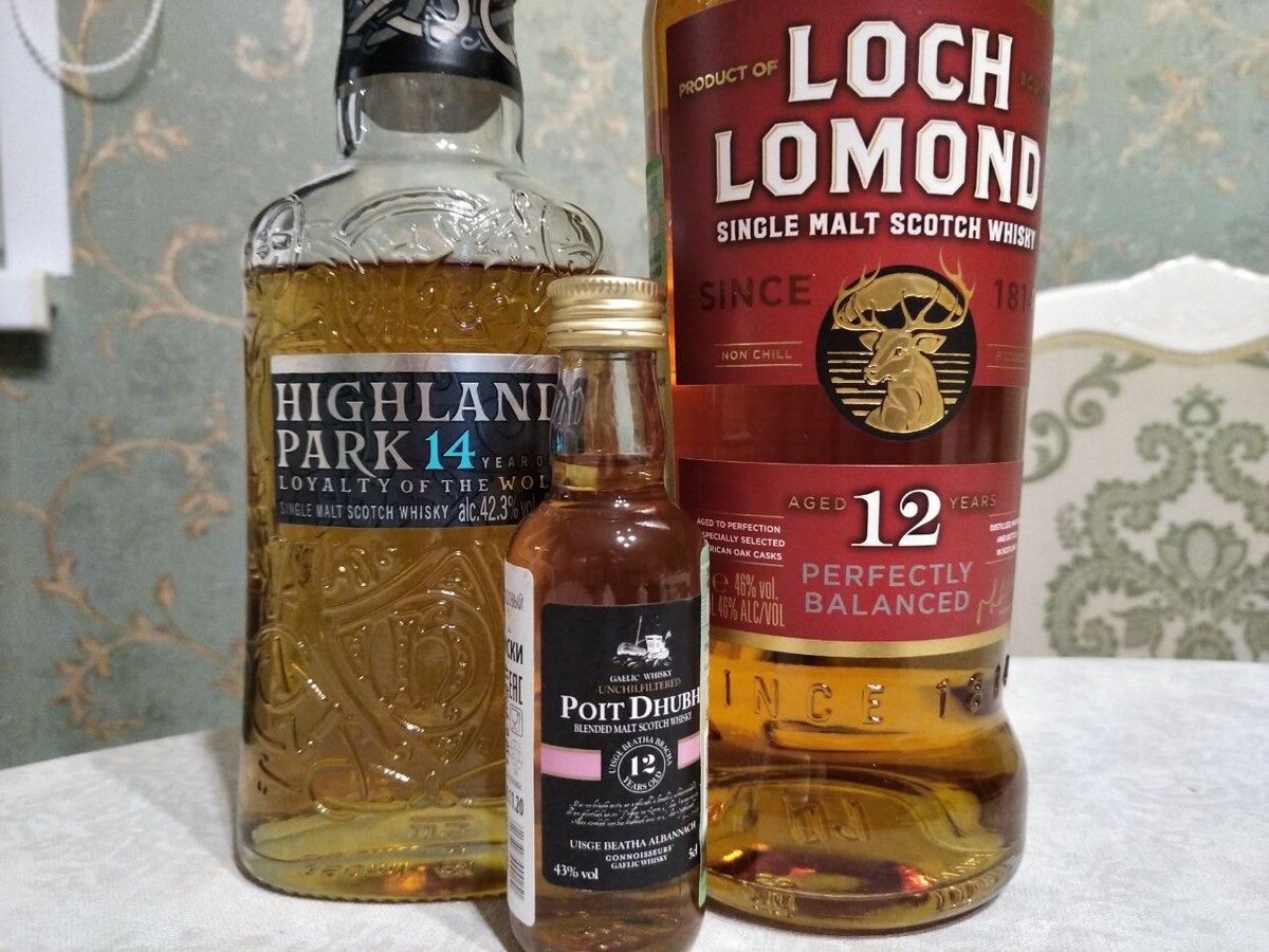 Скотчи не простые, а с алкоголем больше 40% и возрастом 12 лет и более. Давайте точно: Highland Park Loyalty of the wolf Single Malt: выдержка 14 лет, алкоголя 42,3%, дата розлива не указана. Poit Dhubh Blended Malt: выдержка 12 лет, алкоголя 43%, розлив в ноябре-2020. Loch Lomond Single Malt: выдержка 12 лет, алкоголя 46%, розлив в октябре-2022. Пробовал по возрастающему содержанию алкоголя, а не по возрасту. Highland park Уже описывал, и был, помню, не в восторге. В этот раз даже хуже. Сено, бергамот, дерево, а также картон, клей, креазот. Богато, отрицать не буду.