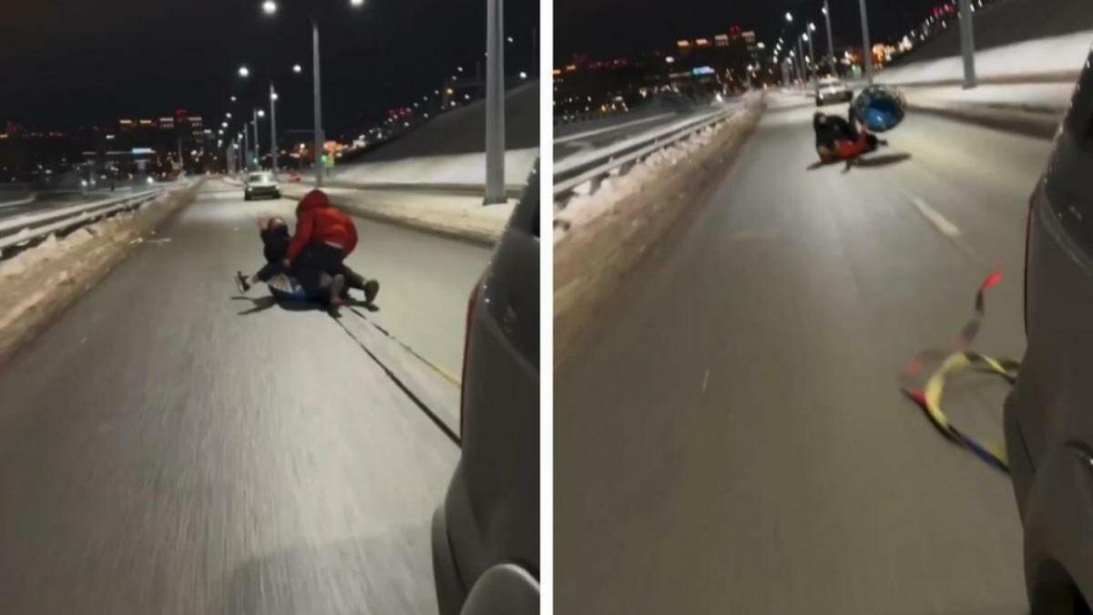 Неадекватный водитель в Новосибирске протащил людей на плюшке по автомобильному мосту