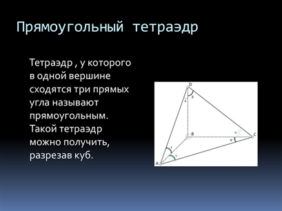 Тетраэдр — простейший многогранник, гранями которого являются четыре треугольника. Тетраэдр является треугольной пирамидой при принятии любой из граней за основание. У тетраэдра 4 грани, 4 вершины и 6 рёбер. Тетраэдр, у которого в одной вершине сходятся 3 прямых угла называют прямоугольным, а противоположный этим 3-м прямым углам 4-ый треугольник (грань) назовём гипотенузным. Прямоугольный тетраэдр – угол между всеми тремя ребрами при одной вершине является прямым, т.е. равным 90°