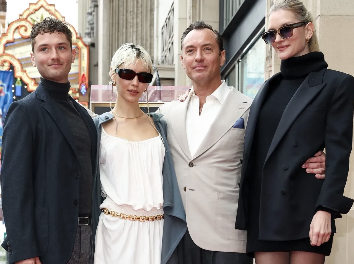 Джуд Лоу, один из самых талантливых и востребованных актёров своего поколения, наконец стал обладателем звезды на Голливудской “Аллее славы”. Церемония стала по-настоящему семейным событием: поддержать 51-летнего актёра пришли его жена Филиппа Коэн и дети — 23-летняя Айрис и 27-летний Рафферти. Джуд появился на церемонии в элегантном сером пиджаке и белой рубашке, а его супруга, которая моложе актёра на 13 лет, выбрала лаконичный, но эффектный образ — чёрное мини-платье в сочетании с блейзером. Их дети, Айрис и Рафферти, выглядели стильными и уверенными, дополняя атмосферу гордости и любви, которая буквально витала в воздухе. В своей речи Лоу поблагодарил всех, кто был рядом на протяжении его карьеры: “Эта звезда — символ всей моей работы, но также и символ той поддержки, которую я получал от своих близких. Я невероятно счастлив делить этот момент с семьёй.” За свою карьеру Джуд Лоу подарил миру множество культовых образов: от загадочного Дикки Гринлифа в “Талантливом мистере Рипли”