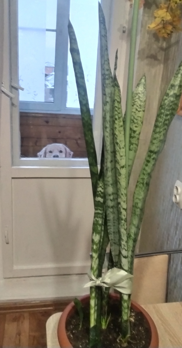 Доброго утра выходного дня всем! Хочу рассказать вам про своего нового жильца. С неделю назад, я вышел на утреннюю прогулку. Погода была пасмурная. Сырая. Проходил мимо какого-то полисадника и увидел на земле, выброшенный кем-то цветок. Присмотрелся. Длинные стебли были не вялые и с корешками. Я сходил на пробежку, затем в магазин. Возвращаясь обратной дорогой, собрал все стебли в пакет. Принёс домой. А знаете почему я его подобрал? У моей мамы был такой цветок. Она звала его щучий хвост. Он у неё был в длинном прямоугольном красивом горшке. Напоминал живую изгородь. Стоял у неё на комоде. Очень мне нравился. Я принёс свою находку домой. Намочил под краном салфетки. Обернул ими корни. Поверх влажных салфеток, обмотал полиэтиленовым пакетом. Положил его на подоконник. Через пару дней купил в фикс-прайсе горшок и грунт для домашних цветов. Развернул корни цветка и посадил его в горшок. Через некоторое время листья разъехались в разные стороны. Цветок высокий, а корни