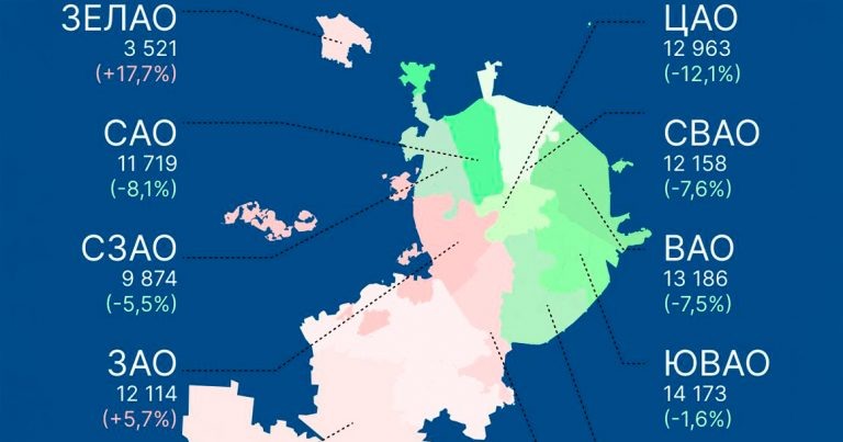 Количество преступлений также резко сократилось в CAO (–8,1%, 11 719 дел), СВАО (–7,6%, 12 158) и BAO (–7,5%, 13 186). Лидерство по общему количеству совершенных преступлений сохраняется за ЮBAO (–1,6%, 14 173 дела), а по динамике годового прироста на первое место выходит ЗелАО (+17,7%, 3 521). Рост преступности также зафиксировали в ЗAO (+5,7%, 12 114 дел) и Новой Москве (+4,3%, 5 165).