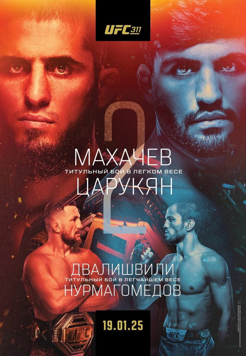 📌 Дата: 19 января 2025 года Смешанные единоборства снова на пике популярности, и UFC 311 обещает стать одним из самых ожидаемых событий в мире MMA. Официальный постер турнира уже представлен, и он вызвал бурное обсуждение среди фанатов. В этом турнире зрители смогут увидеть несколько захватывающих боев, которые могут изменить расклад сил в различных весовых категориях. ▎Главные бои турнира На UFC 311 запланированы два поединка, которые уже привлекли внимание поклонников: 1. Ислам Махачев против Армана Царукяна • Этот бой обещает стать настоящим зрелищем. Ислам Махачев, действующий чемпион легкого веса, будет защищать свой титул против одного из самых перспективных бойцов дивизиона — Армана Царукяна. Оба спортсмена известны своим мастерством в борьбе и striking'е, что делает этот поединок особенно интригующим. 2. Мераб Двалишвили против Хабиба Нурмагомедова • В этом поединке встречаются два выдающихся бойца, каждый из которых имеет свои уникальные навыки. Мераб Двалишвили, обладающий