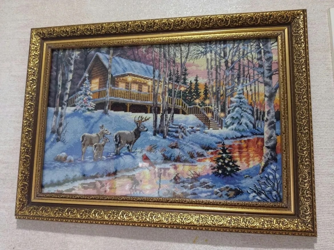 Особо глазастые читатели разглядели в прошлой статье на стене готовую работу «Зимняя хижина» от Дименшенс). И я подумала - а на канале то я ее не показывала (как и много много других работ). Надо исправляться. В 2019 году Дименшенс выпустил новинку - Winter Cabin, или Зимняя хижина. Восторг среди вышивальщиц зашкаливал - разработка в духе «старого доброго Дима», очень атмосферная, рождественская. Сюжет просто излучал уют, зимнее тепло в доме и морозец на улице). Мимо я конечно пройти не могла и заказала набор сразу, как только он поступил в Россию. В руки он мне попал в июне 2019 года и естественно сразу начал вышиваться. Это тот редкий случай, когда сюжет вышивался от начала до конца без откладываний) Фото процесса отшива осталось много, как ни странно. Вышивала по бумаге (перенабор появился уже когда работа была готова). Да, я умею вышивать по бумажной схеме😂. Тем более схемы дименшенс для меня легко читаемы, логически понятны. Схема цвето-символьная, очень легкая. На фото ниже ви