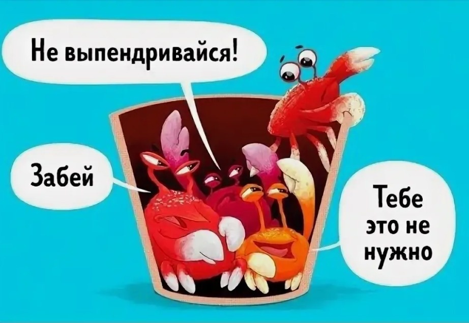 Токсичное окружение или ведро с крабами Друзья, я обещала вам рассказать про то, как 6 лет назад я вылезла из ведра с крабами и начала выстраивать новое окружение, которое соответствует моим ценностям, поддерживает мои планы и цели, и ,конечно же, мечты - амбициозные, крутые, масштабные! Кстати, что такое ведро с крабами? Вся суть теории ведра с крабами заключается в том, что каждый краб сможет выбраться из ведра, но только в одиночке. Если же в ведро поместить одновременно несколько крабов, ни один из них выбраться уже оттуда не сможет, так как все крабы цепляются за того, который пробует выползти, тем самым мешают ему это сделать и сами вылезти не могут. Люди, которые сейчас меня окружают, не убеждают меня в том, что я тупая и все мои планы идиотские и нереальные учиться уже поздно я ничего не смогу, так как это мне не по силам Теперь я получаю поддержку и веру в себя. Я открываю для себя другие пути решения, формирую новое мышление и нестандартные стратегии поведения. А что бы