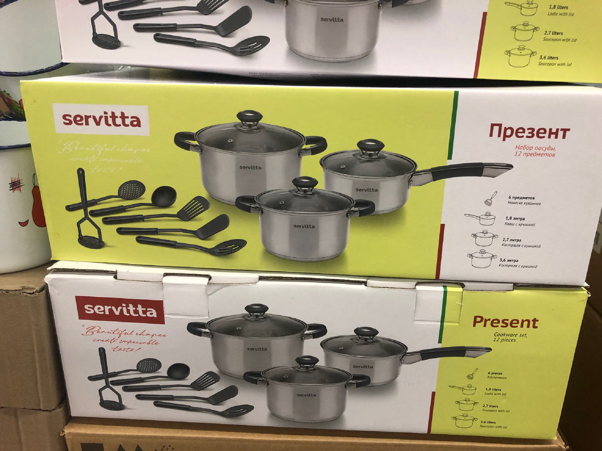 В продаже есть наборы посуды Servitta Present. Посуда из нержавеющей стали. В наборе 2 кастрюли разного объема и ковш в комплекте со стеклянными крышками. Также в этом наборе еще и аксессуары для кухни 6 предметов. Изготовитель Китай. Цена 2860 рублей.