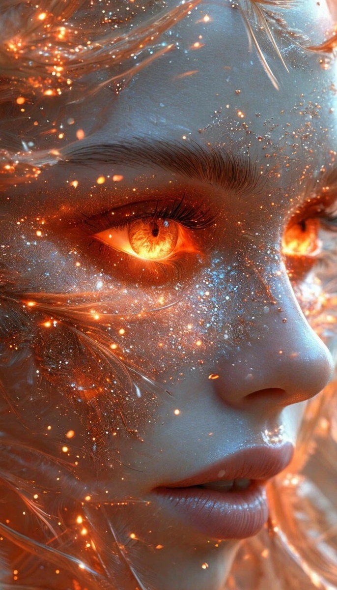 Лакмус, тестовые блёстки, потоки перьев, туманность, огонь в глазах, фэнтези, эфир, снежинки, нежность, фрактал, вуаль, воздушность, вихревые потоки, огненный светодиод, крупный план, 3D-рендеринг.