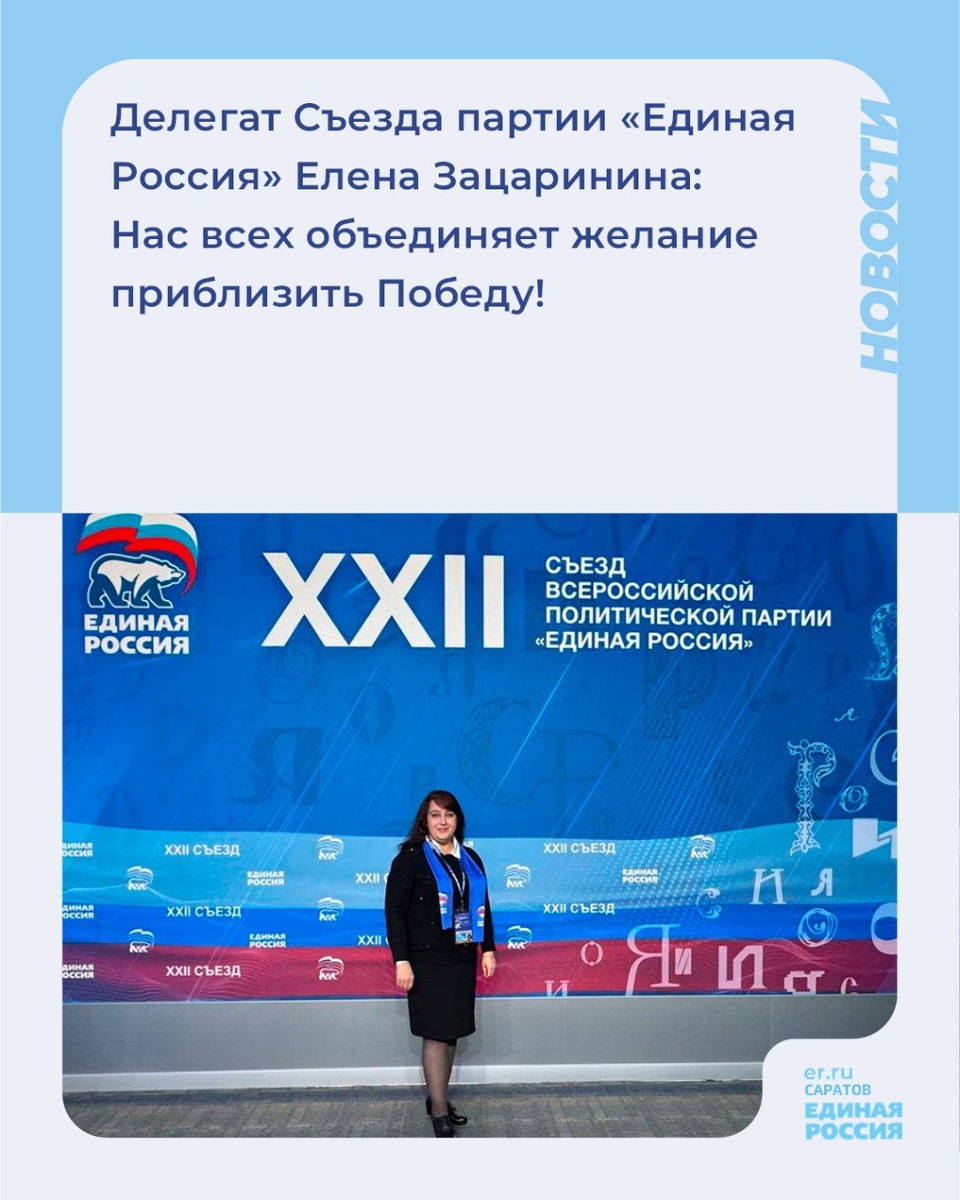 🇷🇺Делегат XXII Съезда «Единой России» из Озинского района, секретарь первичного отделения партии «Сланцерудниковское» Елена Зацаринина рассказала, что в числе главных вопросов на Съезде будет обсуждаться участие партии в помощи фронту. 💬«Для меня, как мамы участника СВО — это важнейшее направление работы. Фронту и пострадавшим районам помогают все поколения наших земляков. Люди собирают гуманитарную помощь, медикаменты, теплые вещи, плетут маскировочные сети и так далее. Нас всех объединяет желание приблизить Победу», - подчеркнула Елена Зацаринина.