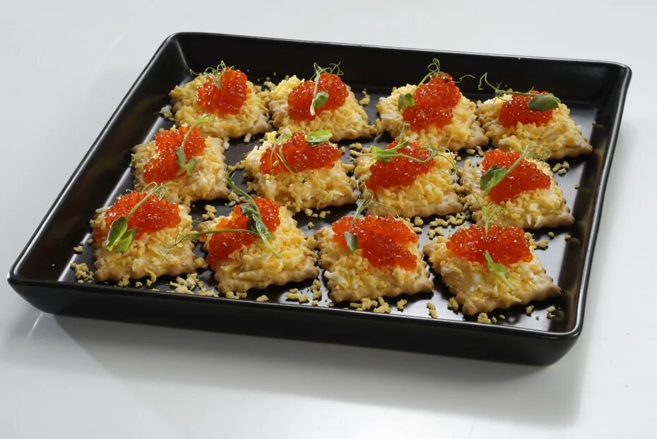 Контраст хрустящих крекеров и лопающихся на языке икринок хорош сам по себе. А сыр во всех отношениях служит тут связующим звеном: во-первых, добавляет простоватому вкусу сухого печенья пикантности, во-вторых, скрепляет все элементы в единое целое, чтобы канапе не развалились в руках. Ингредиенты Крекеры 200 г Сыр чеддер 200 г Куриное яйцо 2 штуки Чеснок 2 зубчика Майонез 3 столовые ложки Микросалат по вкусу Икра 150 г 1.Подготовить все ингредиенты. 2.В кипящую воду с помощью ложки положить яйца. Варить 12 минут. 3.Готовые яйца быстро охладить в воде. Очистить, отдельно натереть на мелкой терке желток и белок. 4.Сыр натереть на мелкой терке. 5.Чеснок очистить, пропустить через пресс и добавить к сыру. 6.Добавить тертый белок. 7.Заправить сырную массу майонезом и хорошенько перемешать. 8.Намазать крекеры с одной стороны получившейся сырной массой и выложить на блюдо. 9.Сверху посыпать крекеры тертым желтком. 10.Положить на каждый крекер микрозелень. Сверху украсить ложкой икры и подава