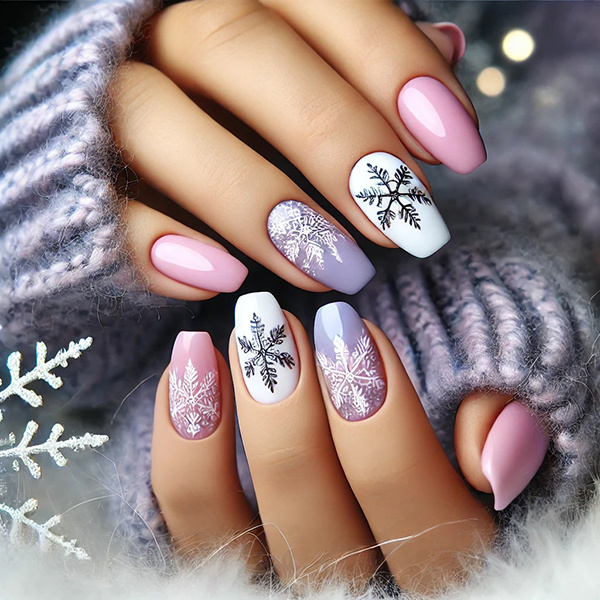 - Пастельные тона. Мягкий розовый, мятный или лавандовый оттенки — идеальный выбор для нежного зимнего дизайна.