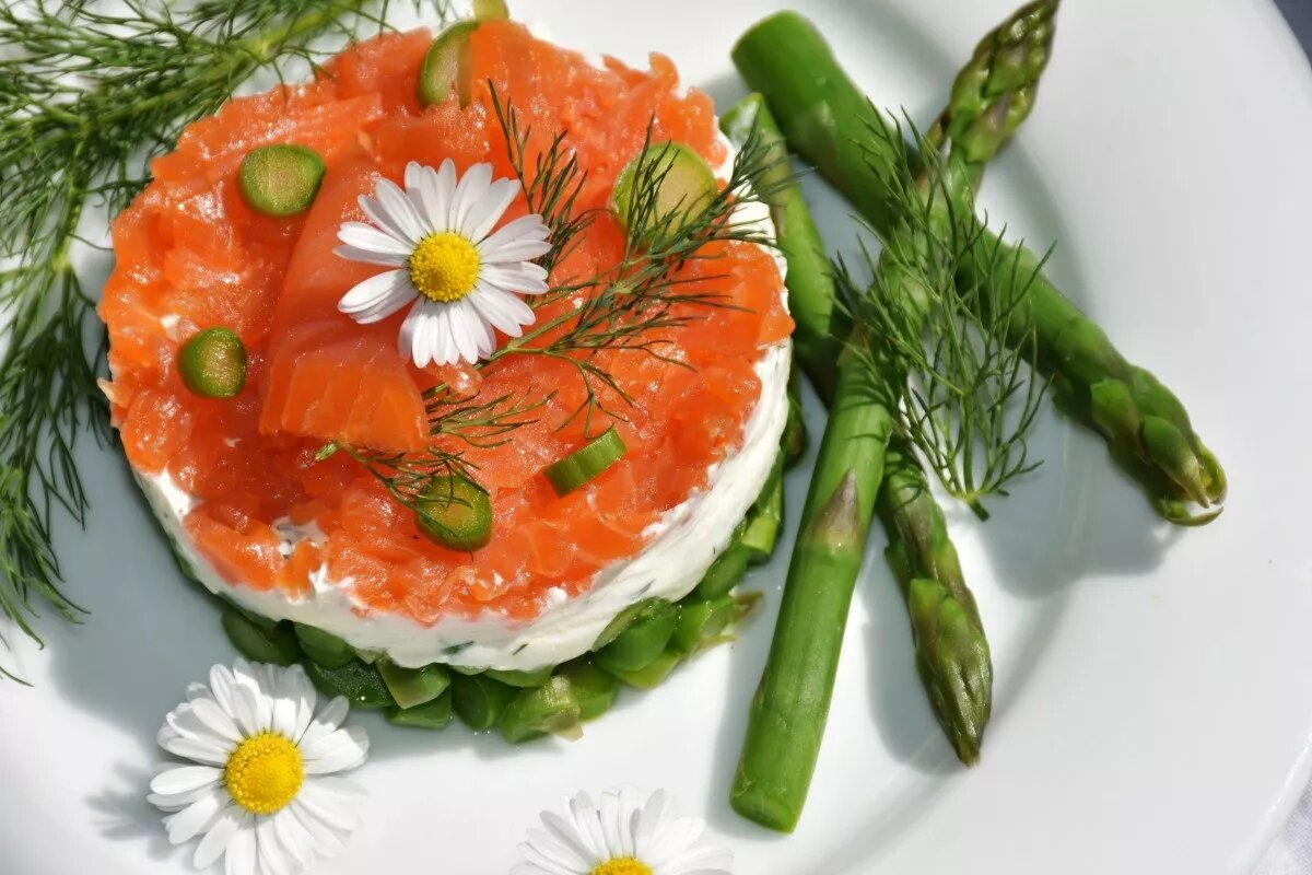 Яйца отварные — 4 шт.,красная рыба — 150 г;авокадо — 1 шт.;свежий огурец — 1 шт.;мука — 1 ст. л.;крахмал — 1 ст. л.