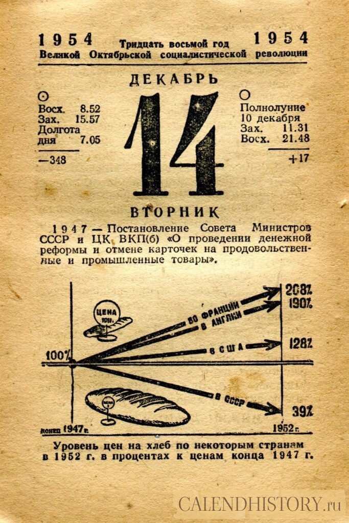 Итак, сегодня 14-го декабря и у нас на календаре 1954-й год. Перед нами листок советского календаря Политиздата. На календаре у нас вторник - 14 декабря 1954-го года. Уровень цен на хлеб по некоторым странам в 1952 г. в процентах к ценам конца 1947 г. 1947 — Постановление Совета Министров СССР и ЦК ВКП(б) «О проведении денежной реформы и отмене карточек на продовольственные и промышленные товары». *** Оборотную сторону листка этого календаря можно посмотреть у нас по ссылке на сайте. Другие листки советских календарей смотрите у нас на сайте - CALENDHISTORY.ru ПОСМОТРИТЕ ЕЩЁ ЛИСТКИ ОТРЫВНЫХ КАЛЕНДАРЕЙ: