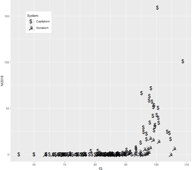 Производство научной продукции на душу населения практически незаметно в странах со средним IQ ниже 90 и остаётся в основном незначительным в странах со средним IQ ниже 95.