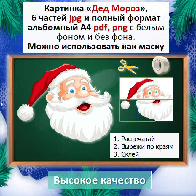 Картинка «Дед Мороз» к Новому году 6 частей и A4. Оформление класса, доски, кабинета школы, детского сада. Маска Деда Мороза. Фотобутафория