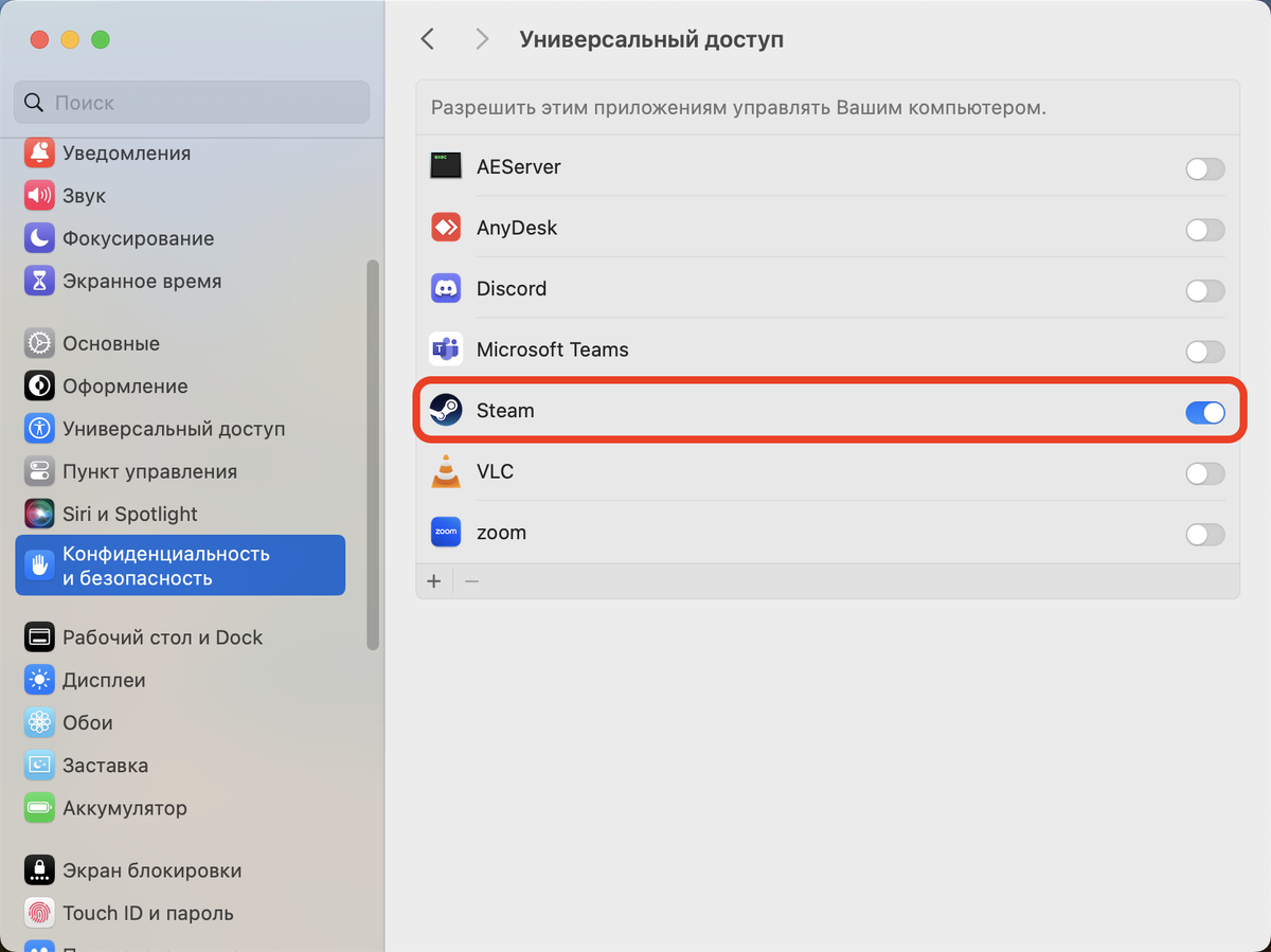 Доброе время суток Данное руководство возможно поможет исправить проблему, если геймпад определяется системой, физически работает в Big Picture, но не отзывается в играх стима Настройка: 1) В настройках системы macOs переходим в "Конфиденциальность и безопасность" => "Универсальный доступ" и выбираем steam. 2) В настройках steam переходим в "Контроллер" выбираем нужный геймпад. Если не понятно, какой нужно активировать, то это можно увидеть, зайдя в настройки любой игры на вкладку "Контроллер". Напротив нужного геймпада будет синий кружок. 3) Осталось все перезагрузить и насладиться игрой 👾