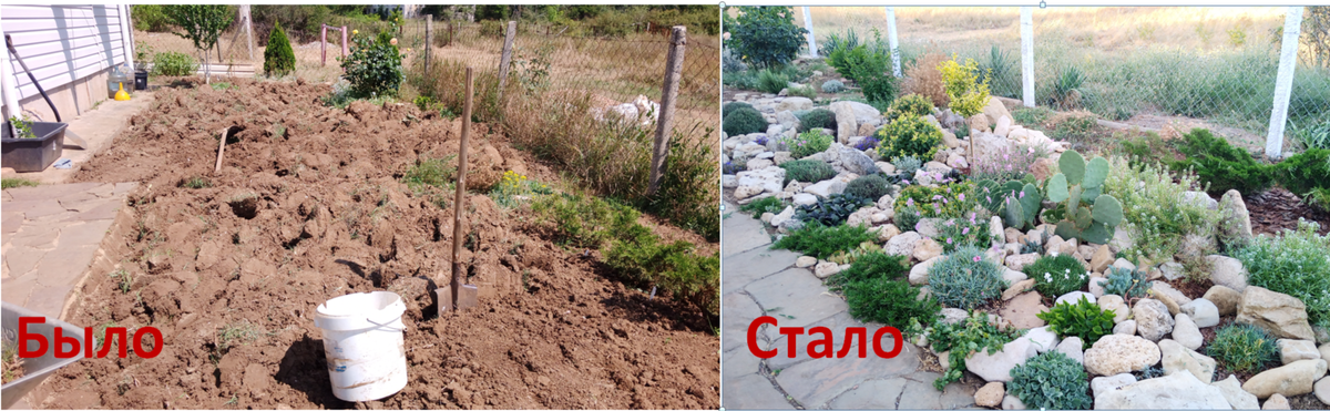 Сеанс хвастовства продолжается. Потерпите, пожалуйста. Я ж бывшая отличница - раз уж начала, то теперь пока не закончу до конца, не остановить. Эту главу моего годового садового отчёта можно было бы оформить в виде одного фотоколлажа: И было бы, пожалуй, достаточно. Всё понятно и слов не надо. И труды тяжёлые (во всех смыслах) видны и результат заметен. Но вы ж уже знаете, что я по отчётам соскучилась). Я люблю камни. На нашем берегу их много и поэтому на море я часто хожу с рюкзаком. Не смотря на то, что камней за последние годы принесено с пляжей не мало, создание рокария прошлой осенью в мои планы не входило. Мне казалось, что такое сложное предприятие мне пока не по силам. Всё произошло случайно. Наши соседи, заканчивая свой крымский дачный сезон, подарили мне несколько горшочков цветущих однолетников. Подарок был приятным и неожиданным. Хотелось успеть вернуть соседям до отъезда их красивые горшки, и, значит, сажать цветы надо было срочно. Куда? А почему бы не создать маленькую