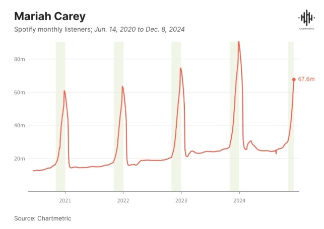 Согласно данным Chartmetric, всплески прослушивания рождественских хитов, таких как праздничная эссенция Мэрайи Кэри«All I Want for Christmas Is You», начинаются уже 1 ноября и сохраняют свое праздничное доминирование до 2 января.