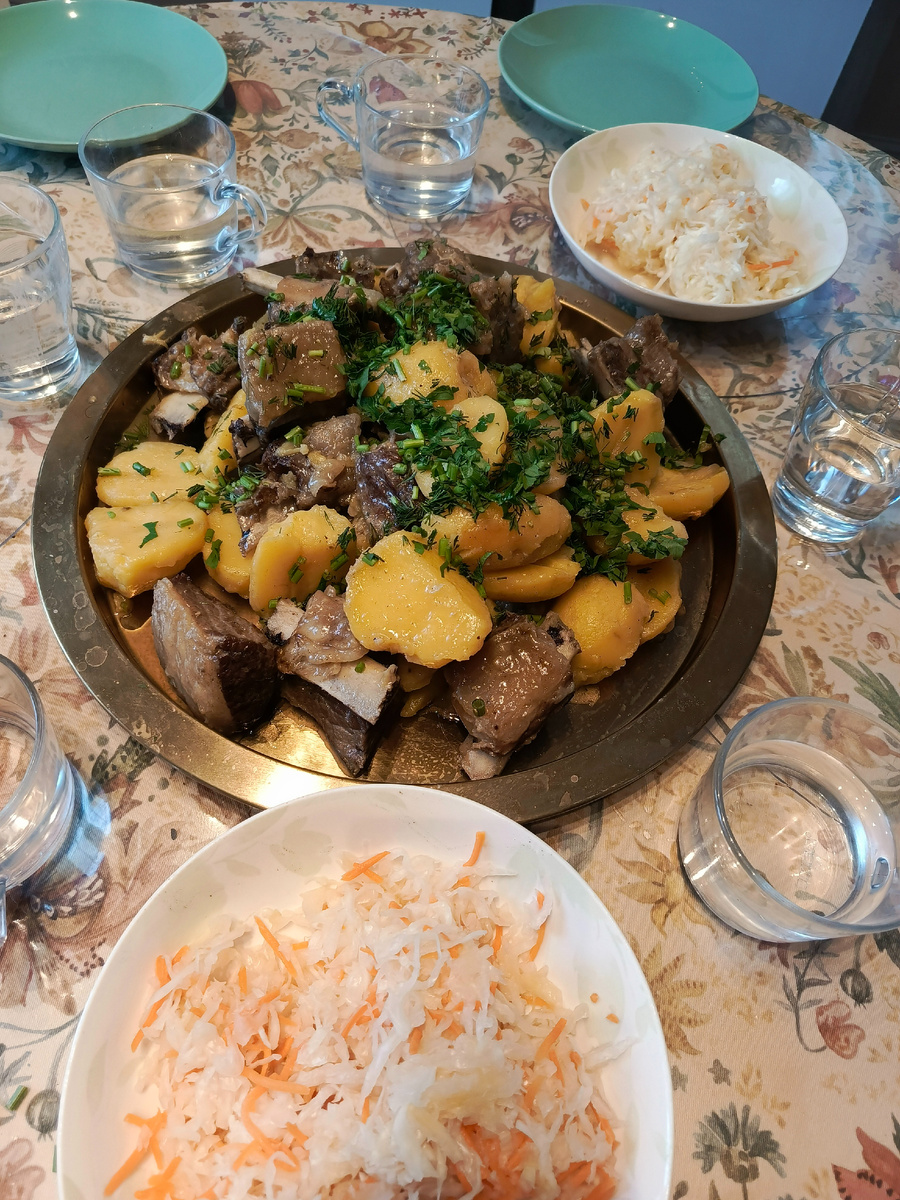 Утром глава нашего семейства сказал нам, что сегодня будет блюдо на костре и баня. Сказал и приготовил такую нереальную вкуснятину, а вечером натопил шикарную баню. В этот раз обошлись без пожара. Я вот здесь о пожаре рассказывала Блюдо на костре оказалось мясом с картошкой, вот вроде ничего особенного, но очень вкусно! Сначала нужно сделать вот так Обжарить до золотистости картошку, достать её а потом вот так сделать Попробуйте, получается ну очень вкусно! Дети сказали, что такую вкусную картошку они никогда не ели.