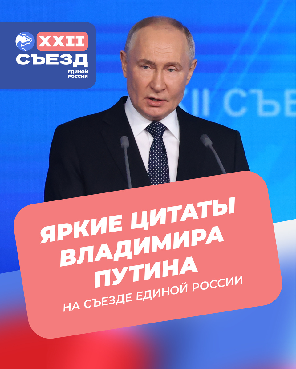 Владимир Путин выступил на Съезде партии. Президент подчеркнул, что Единая Россия работает именно там, где решается судьба страны!Собрали важные цитаты главы государства в наших карточках.