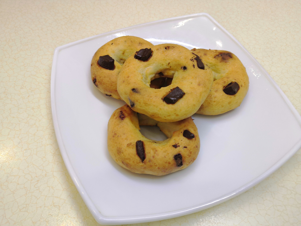 2. Разделить тесто на нужное количество кусочков. У меня семь. Влажными руками сделала колечки. Оставшиеся кусочки шоколада чуть вдавила сверху.