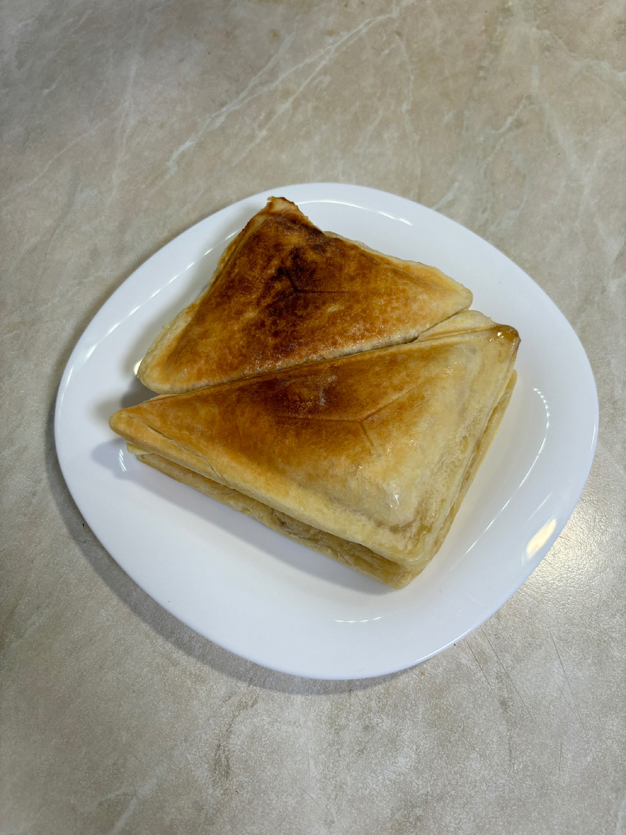 Тесто слоеное дрожжевое яблоки сахар корица подсолнечное масло Тесто размораживаем, режем на квадраты, слегка растягиваем. Режем яблоки на дольки. Сахар смешиваем с корицей. На одну сторону квадрата выкладываем сахар с корицей и дольку яблока, сворачиваем в треугольник. Смазываем сендвичницу маслом, разогреваем. Выкладываем пирожки. Печем 5-7 минут. Готово!