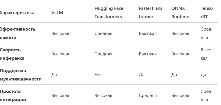- Скорость инференса: VLLM конкурирует с FasterTransformer и ONNX Runtime, предлагая высокую производительность при обработке большого количества запросов.