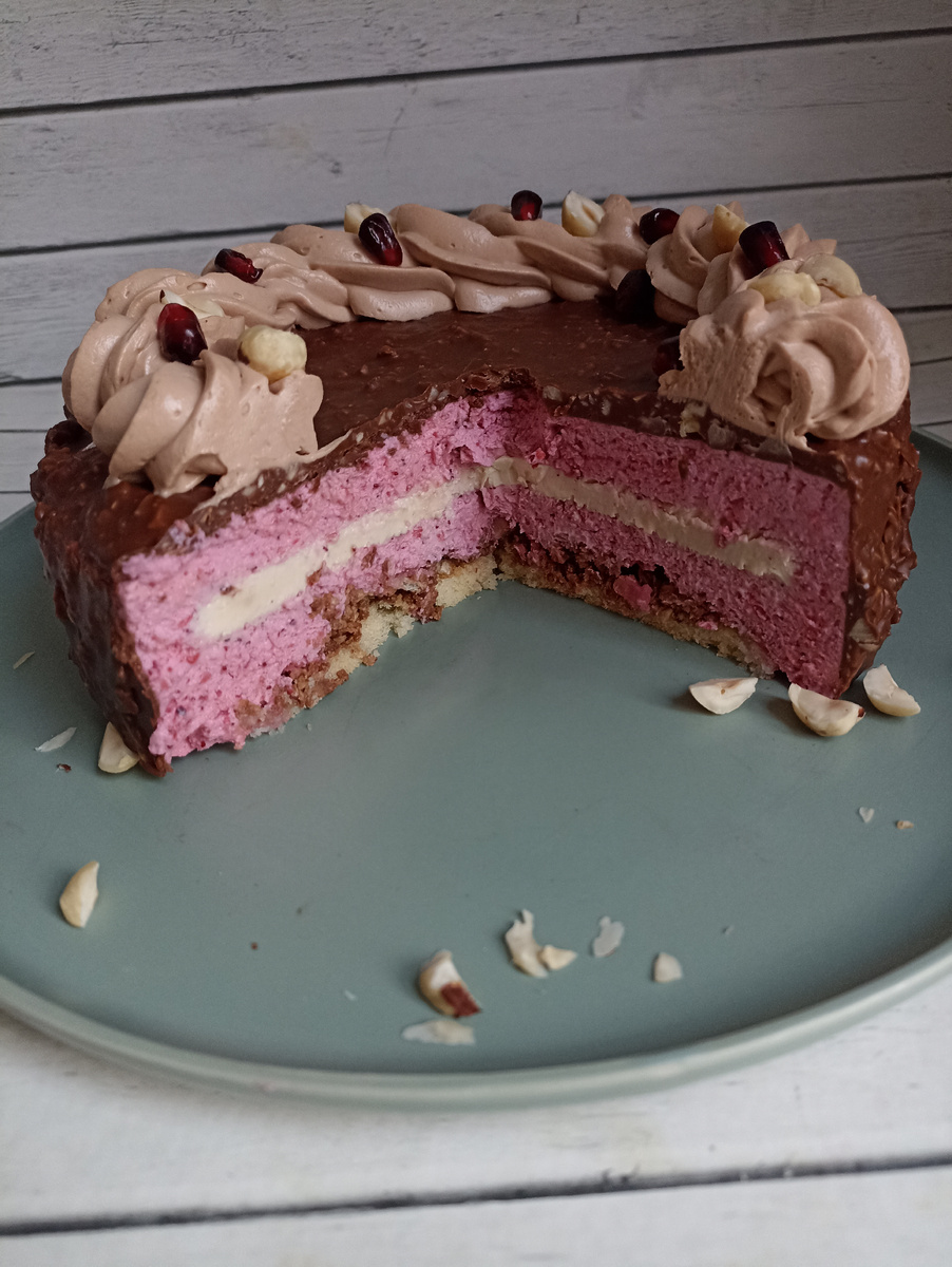 Муссовый торт "Бруска". Брусничный мусс, карамельный крем, сверху глазурь Гурмэ ( с фундуком).