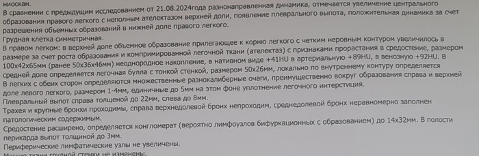 Вчерашний день оказался для нас очень знАчимым и тяжелым. Совершенно неожиданно позвонили с поликлиники и предложили забрать направление на КТ брюшной полости. Обрадовались мы очень. Женя сразу поехал и, получая свое направление, на всякий случай спросил, есть ли уже обследование грудной клетки в базе. Описание КТ было, и заведующая сразу отдала его мужу. Когда Женька вернулся домой, я как раз была занята (работаю на дому). Зашел с совершенно каменным лицом, бросил бумажки на стол и молчит. Я поняла, что тут что-то не так, а отвлечься сразу не могу! Работаю же. Схватила описание, пробежала глазами по диагонали, толком не вникая. Но даже прочитав вскользь поняла, что ситуация там нехорошая. Для тех, кто не любит вчитываться, скажу коротко -- опухоль увеличилась, образовался ателектаз (спадение легкого). Так же наблюдается плевральный выпот и легочная булла, которой раньше не было. Ну, и другие "мелочи" в виде множественных метастаз, расширенного средостения и непроходимых бронхов, котор