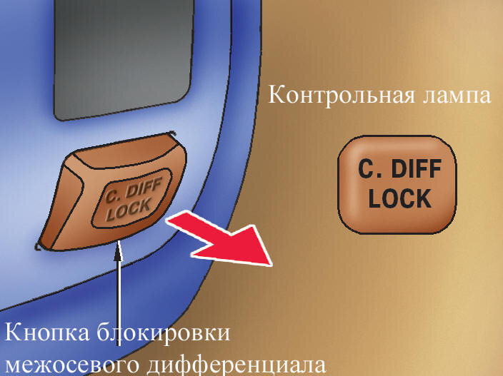Система блокирования межосевого дифференциала предназначена для повышения тяговых качеств автомобиля в следующих ситуациях: – если передние или задние колеса отрываются от дорожного покрытия или соприкасаются со скользким покрытием; – одно из четырех колес отрывается от дорожного покрытия или соприкасается со скользким покрытием. Профилактические меры При неравномерном износе передних или задних колес может нарушаться плавность блокирования или разблокирования межосевого дифференциала. Перед блокированием дифференциала убедитесь, что колеса не пробуксовывают. Разблокируйте дифференциал сразу после пользования блокировкой. В тех случаях, когда контрольная лампа на панели приборов не загорается или гаснет после повторного нажатия кнопки блокирования дифференциала и автомобиль проезжает небольшое расстояние, обратитесь в службу автосервиса для проверки электрической цепи и механизма блокирования. Меры безопасности При нормальных условиях движения следует разблокировать межосевой дифф