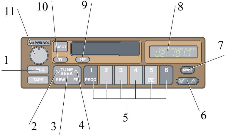 6. Если требуется получение дорожной информации, а станция, на которую настроен приемник, вещает другую программу, то нажмите кнопку TI и удерживайте до тех пор, пока на дисплее не появится символ ТА (Traffic Announcement). При появлении этого символа приемник перестает принимать все программы, кроме дорожной, или если передача дорожной информации на данный момент отсутствуе, и в плейер вставлена кассета, то включается плейер, который автоматически выключается в момент начала вещания дорожной информации. После окончания передачи или если сигнал становится слабым, включается предыдущая программа.