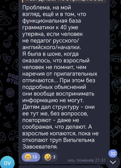 Недавно подняли тему, почему у взрослых иногда так туго идет грамматика, что им нужны оооочень обширные объяснения "что? куда? почему? как? сколько раз?". И то, не факт, что сработает после 50 круга разжевывания.😁