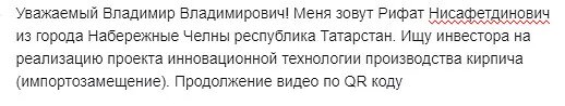 Получатели: 1) "udprf@gov.ru" , 2) mail@fparf.ru ( даты- 27 ноября в 7:41 2024- года. Жду так долго ответа. ) Здравствуйте! Я Рифат Бадертдинов из Набережных Челнов республики Татарстан. У меня проблема. Подробнее далее- В начале декабря 2021- года мне позвонили (московский номер). Преставился Сергейем. Пробил номер телефона (Сергей Хохлов, ген. директор ООО "Брик Парк",тел. 89261616912 и имеет кирпичный завод " Донские зори" тел. 84952323931) Диалог : у меня Подмосковье проблемный завод по производству керамического кирпича. Не будет ли возможность внедрить Вашу технологию на моем заводе. Я свою очередь рассказал о своей патентованной- https://676.su/hKiN ( https://676.su/PBD7 )