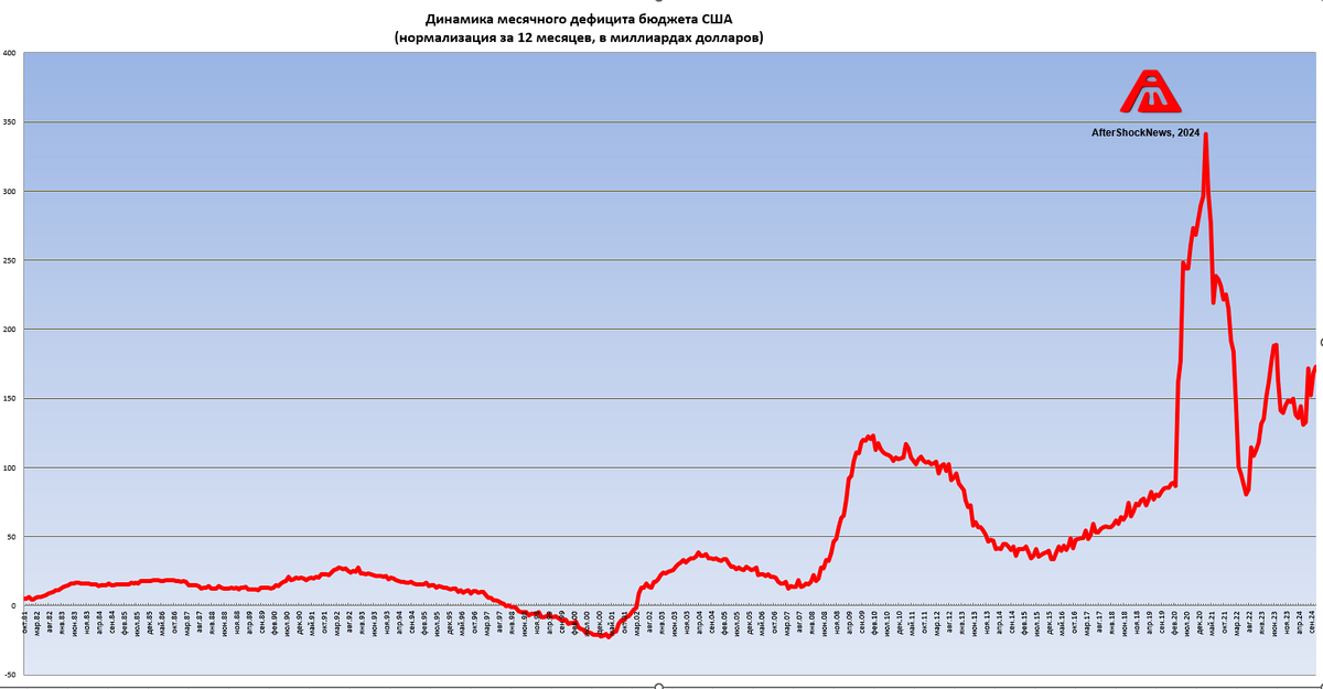 Текущее состояние бюджета и краткосрочной части пирамиды ГКО США: 1. Доходы бюджета США стагнируют - в октябре-ноябре (с начала фингода) собрано $627 ярдов налогов, что существенно меньше, чем год назад ($678 ярдов), даже без учета инфляции. 2. В то же время расходы растут с дикой скоростью - за тот же период они составили $1252 ярда резаной против $1058 год назад. 3. Таким образом финансовый год в США начался с двухкратного превышения расходов над доходами! 4. В целом за 12 последних месяцев доходы бюджета США составили $4868 ярдов, а расходы $6939. Разрыв 42.5% и без того огромный, но как видим в предыдущем пункте, ситуация продолжает деградировать! На графиках динамика дефицита бюджета США выглядит так: 5. Динамика краткосрочной части пирамиды ГКО США (сумма к погашению в ближайший месяц / квартал / полугодие / год): Пояснения к графикам: а) Оттенками красного - краткосрочная часть пирамиды ГКО США (к погашению в следующие 12 месяцев / 6 / 3 / ближайший месяц) в динамике б) Ч