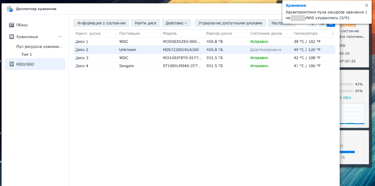 Всё в этом мире не вечно и время от времени требует замены. Это касается и жестких дисков. В этой статье расскажу как заменить диск на Вышел NAS Synology. Сразу отмечу, что процесс сильно зависит от модели устройства, конфигурации и причин замены. Так как система предназначена для домашнего использования, она не подразумевает большого количества дисков, высокой нагрузки и как следствие регулярной замены. Если на массивах уровня enterprise диски могу “вылетать” по несколько раз за неделю, то в домашнем NAS это обычно целое событие. Как результат, мы получим как минимум проходку в производительности, а как максимум необходимость даунтайма. Не все NASы Synology поддерживают горячую замену, так как для доступа к диску может потребоваться вскрытие корпуса. Если в вашей конфигурации используется 1 диск или любой другой тип RAIDa не поддерживающий отказоустойчивость хотя бы одного диска, то могут возникнуть проблемы. Честно говоря не уверен, что процедуру получится запустить в целом, увы попр