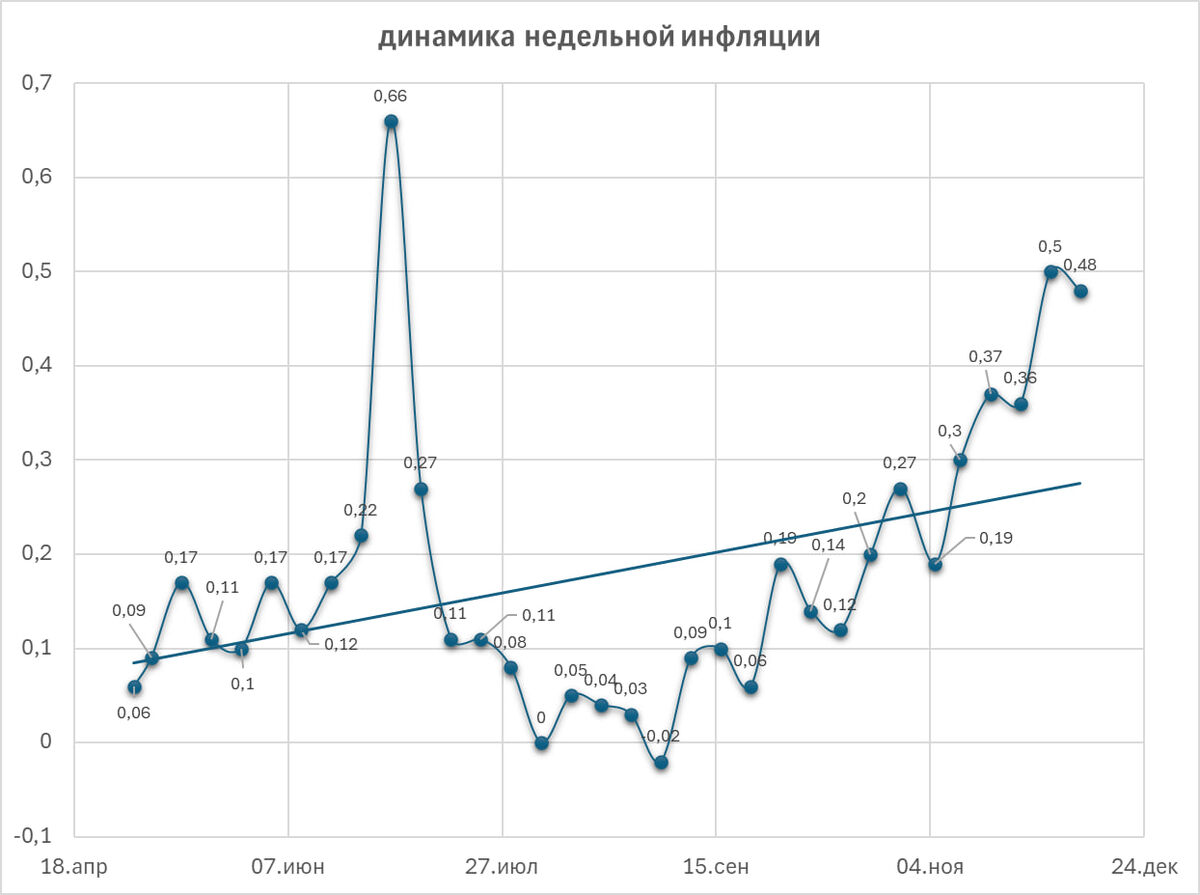 Последние данные по недельной инфляции с 3 по 9 декабря по-прежнему ужасают, но на капельку меньше, чем на прошлой неделе. Они прям подводят к мысли, что ситуация в России отдаленно схожа с турецкой первой половиной 2024 года. Напомню, тогда инфляция в Турции находилась выше 60%, а ключевая ставка составляла 50%. Т. е. инфляция была выше ключевой ставки. Теперь мы видим такую же ситуацию в России, если ориентироваться на темпы инфляции, а не на годовые значения. Абзац выше — это в какой-то степени сарказм и одновременно правда. Т. к. темпы инфляции отражают ее силу в текущий момент. А годовая инфляция демонстрирует ее силу на годовом отрезке. Чтобы получить такую годовую инфляцию, нужно, чтобы эти темпы сохранились на протяжении целого года. Что, конечно, маловероятно. Или нет? Время покажет. А теперь про данные. За неделю прирост цен по данным Росстата составил 0,48% после 0,5% неделей ранее. Несмотря на то, что рост замедлился, он по-прежнему катастрофический. Для сравнения, сейчас с