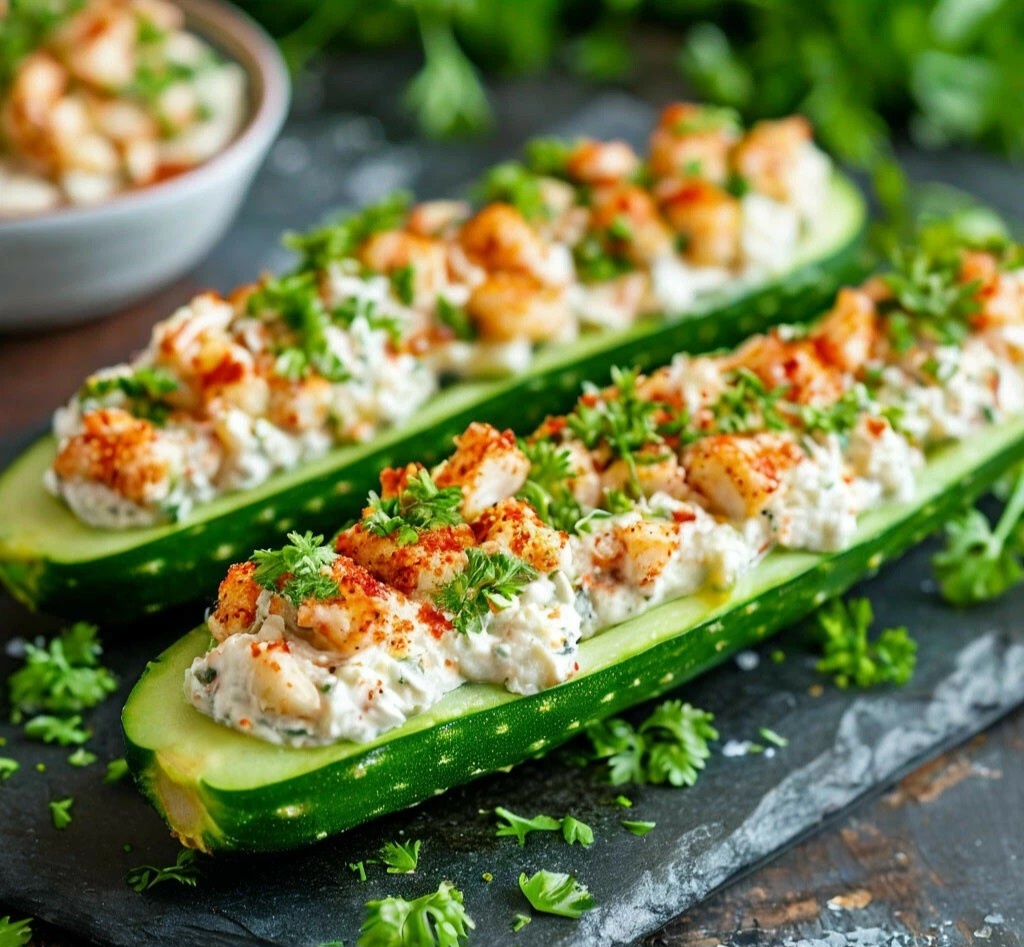 Ингредиенты: - 3 длинных огурца - 200 г крабового мяса или палочек - 100 г сливочного сыра - 50 г майонеза - соль и перец по вкусу - зелень для украшения Приготовление: 1. Огурцы разрезать вдоль на две части, удалить семена и часть мякоти с одной стороны. 2. Крабовое мясо нарезать мелкими кубиками, смешать со сливочным сыром и майонезом, посолить и поперчить по вкусу. 3. Наполнить огурцы начинкой из краба, украсить зеленью и подавать к столу. Приятного аппетита!