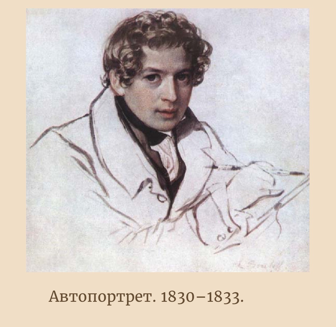 Карл старается. За годы учебы в Италии он создал работы в разных техника, написал около 120 портретов, объединяет которые одна важная черта: люди на портретах художника симпатичные и привлекательные. Они покоряют кто совершенной красотой, кто духовно-интеллектуальной жизнью, и почти всеи — полнотой жизни, то есть ЖИЗНЕЛЮБИЕМ.