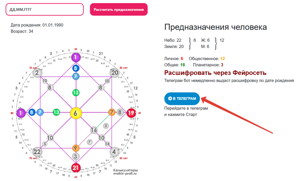 - Потенциальный клиент переходит на сайт через поисковые системы, делает расчёт, а далее ему предлагается кнопка получить расшифровку в телеграмме. В качестве примера - калькулятор по расчету предназначения https://matrix-profi.ru/calculator-prednaznachenie: