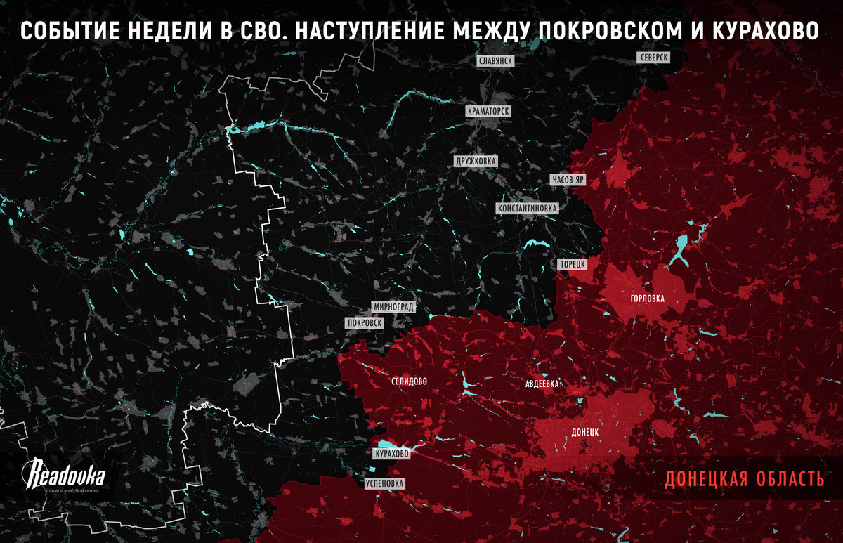 На ближние подступы к городу ВС РФ вышли еще в самом начале сентября, когда неожиданно без серьезных боев пала Новогродовка. Однако штурмовать этот узел обороны в лоб на узком участке фронта – идея заведомо плохая, поэтому осень русские войска посвятили зачистке фланга. Красные стрелы потянулись южнее – к Селидово и Курахово. Вокруг последнего сформировался «мешок», состоящий из 2 половинок, северной и южной, разделенных водохранилищем (само Курахово – на его южном берегу). Под угрозой флаговых охватов ВСУ пришлось отступать, и в настоящий момент северного «мешка» уже не существует. Однако сам город украинская армия удерживала отчаянно, более того, она до сих пор продолжает оказывать сопротивление в его западной части. Интереснее всего ситуация сложилась южнее Курахово. Там ВСУ до последнего держались за цепь опорных пунктов, уходящую с северо-запада на юго-восток. По неясной причине противник решил удерживать эту позицию любой ценой. В результате случилось то, что должно было – от кураховского «мешка» на юге отщипнули отдельный «карман» в районе села Успеновка. 5 декабря ВС РФ продвинулись восточнее населенного пункта, а буквально в последние дни «мешок» сжался практически до самого села и лесопосадок южнее и восточнее. Причем русские войска ворвались в Успеновку и ведут бои внутри, а западнее фронт подпирает Константинопольское.