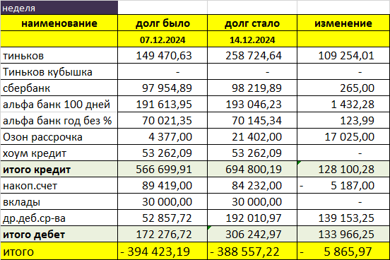 Привет всем! Кратко о своих делах: На этой неделе я ничего не гасила, а только наоборот, увеличивала задолженности на кредитках. Вот с Тинькова вывела в очередной раз 100 тысяч (у меня подписка Тиньков Про, позволяющая ежемесячно это делать без процентов и комиссии). Но все эти деньги бережно хранятся на дебетовых счетах, плюсом к ним я добавила 5800 с зарплаты. Так что мой общий долг уменьшился! А вот картина за весь срок: Тоже неплохо. Приятно, что долг становится меньше. Хотя впереди ещё долгий путь, это только начало. Ну а как дела у вас? Жду комментарии!