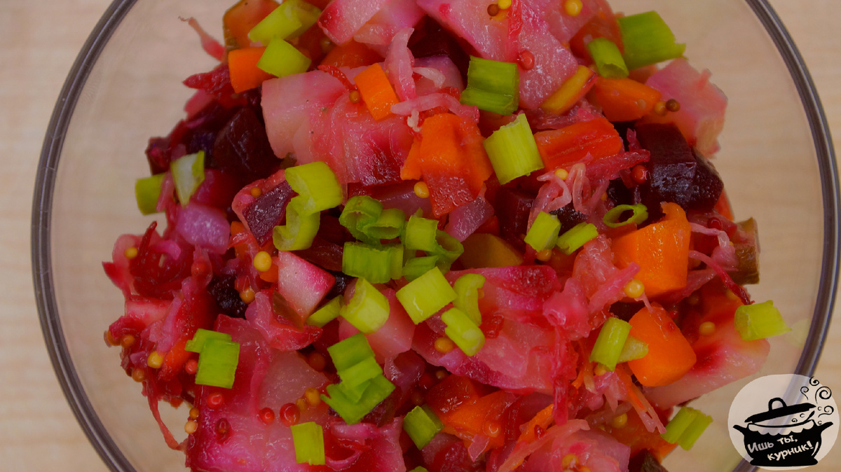 По рецепту "Книги о вкусной и здоровой пище" 1939 года. Варёный картофель, яблоки, огурцы и морковь очистить, нарезать ломтиками, кубиками или соломкой, сложить в миску, прибавить квашеную шинкованную капусту. Горчицу, соль, перец, сахар растереть с маслом и развести уксусом. При подаче к столу овощи смешать с приготовленным соусом, уложить в салатник, украсить ломтиками свёклы, посыпать зелёным луком и укропом. Можно украсить также свежими огурцами, помидорами. На 4-5 шт. варёного картофеля – 1 свёклу, 1 морковь, 2 солёных огурца, 1 свежее или мочёное яблоко, 100 г квашенной капусты, 50 г зелёного лука, 2-3 ст. ложки растительного масла, ¼ стакана уксуса, 1 чайную ложку горчицы (готовой), соль, перец, сахар по вкусу.