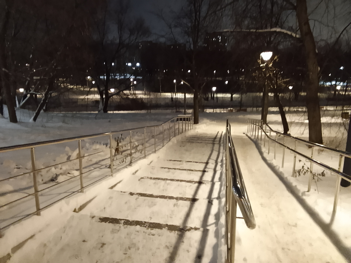 Приближаюсь к проезду Дежнёва. Выбежал на деревянные мостки. Раньше они никак не освещались, а теперь тут прямо в перила встроены светильники. Особенно приколол одиночный светильник, ошибочно, но забавно светящийся красным цветом. Стало безопасней. Это вид назад.