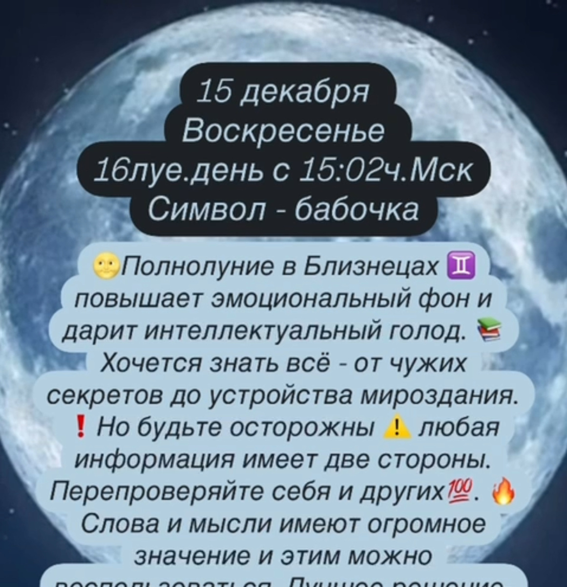 🌝Полнолуние в Близнецах ♊️ повышает эмоциональный фон и дарит интеллектуальный голод. 📚Хочется знать всё - от чужих секретов до устройства мироздания. ❗️Но будьте осторожны ⚠️ любая информация имеет две стороны. Перепроверяйте себя и других💯. 🔥Слова и мысли имеют огромное значение и этим можно воспользоваться. Лучшее решение- находится в гармонии с собой, никого не учить, а лучше и вовсе побыть в уединении. ✔️аффирмации ✔️очищение ✔️уборка ✔️подача объявлений Сны- вещие на месяц, могут показать насущные проблемы и подсказать их решение ❌стрижка ❌покупки #гороскоп #астрология #луна #овен #телец #близнецы #рак #лев #дева #весы #скорпион #стрелец #козерог