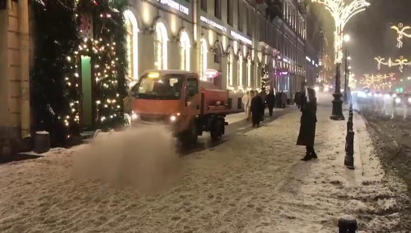 Коммунальные службы в эти минуты очищают тротуары Невского проспекта в Петербурге от снега и наледи