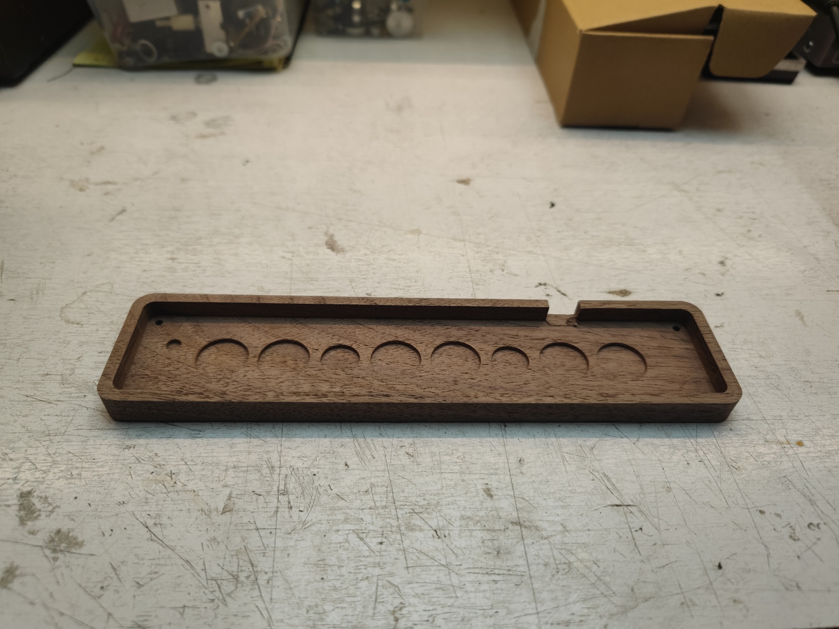 Конечно, в процессе работы, т.к. любое такого рода изделие делается в одном экземпляре чаще всего - неминуемо возникают непредвиденые сложности и баги. У меня, в частности, возникла проблема: верхняя крышка корпуса крепится к бамбуковому бутерброду на четырех винтах по углам. Но корпус длинный, крышка имеет изгиб, и по центру - зияет щель. Было решено установить дополнительные винты, чтобы притянуть крышку к основанию. Приклеивать не хочу, это сделало бы корпус неразборным. Стенки тонкие, поэтому винты будут М2. Сверление - аккуратно, чтобы не запороть заготовки...филигранное сверление. Всего 5 дополнительных винтов. с ответными частями, куда они будут вкручиваться. Плату пришлось также немного подрихтовать, все впритык.