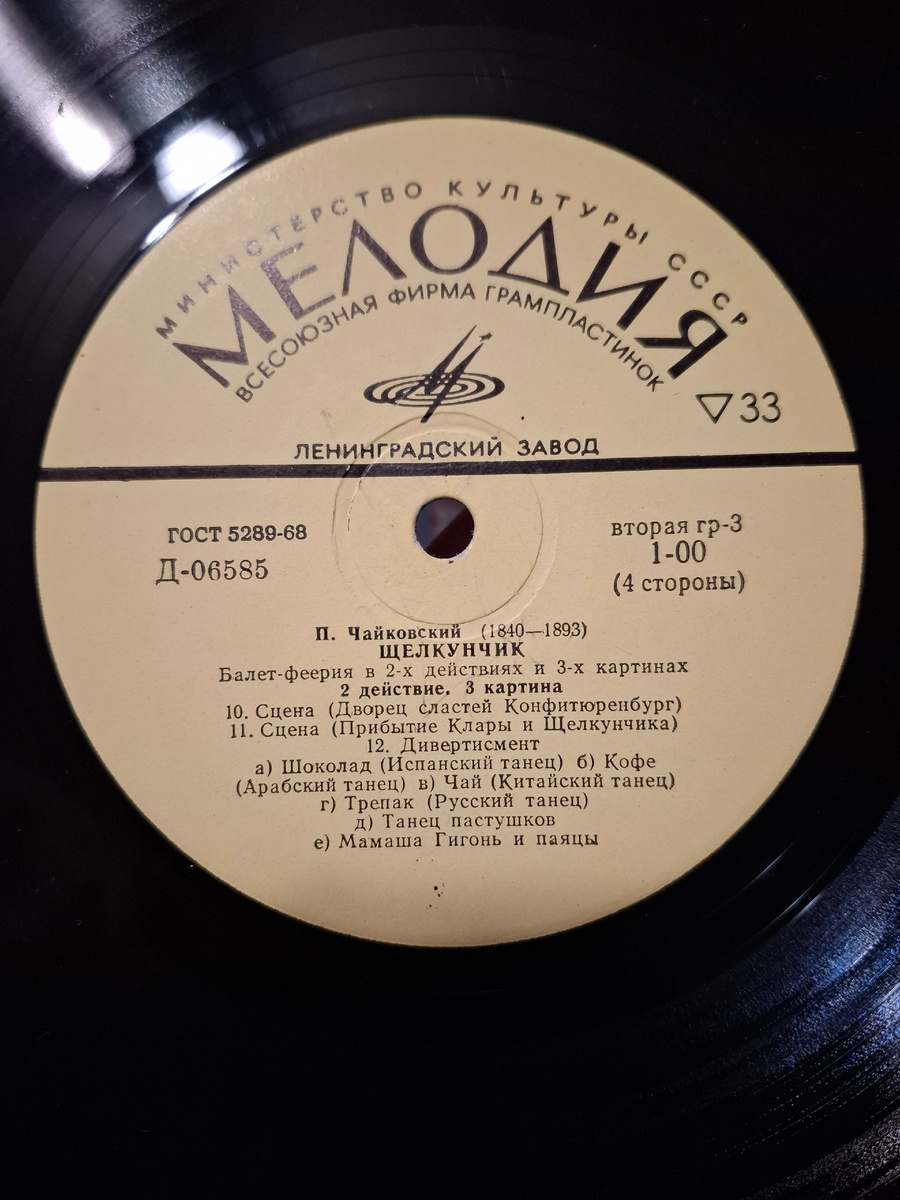 Так вот пластинка. У меня оказалась только одна со вторым действием, первая куда-то канула. Оркестром Большого театра тогда руководил Геннадий Рождественский. Легкое потрескивание при воспроизведении виниловой пластинки, безупречное исполнение, картины того или иного действия моментально возникали у меня в сознании. Танец Феи Драже, Вальс цветов, Адажио, Марш, Трепак, Китайский танец, Танец пастушков, Арабский танец незабываемы и горячо любимы лично для меня.