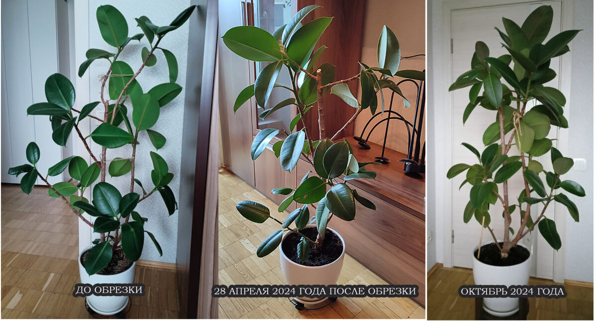 Пока мы были в Питере, и когда лежала пластом с заклиненной поясницей, пришло сообщение от моей клиентки, к которой весной ездила в Архангельск поработать с ее фикусами. На фото один из них в динамике изменений.