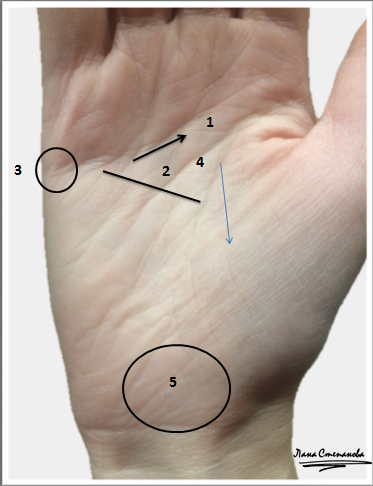 Сегодня вашему вниманию для анализа я предоставлю еще одну ладонь молодой девушки… И так, перед вами снимок ладони, на которой нет сердечного постоянства (1), так как линия сердца некрасива в своем начертании. Девушка зачастую и сама не знает, чего она в действительности хотела бы и очень часто попадает под влияние другого человека, с которым находится в личных взаимоотношениях. О влиянии других людей свидетельствует, и сопутствующая линия жизни, она указана синей стрелочкой. Кстати, у девушки высока вероятность сердечного заболевания, так как островок на линии сердца дублируется с островком на линии жизни и ума (2). Так же у нее были серьезные отношения, на разрыв которых повлияли обстоятельства извне, о чем свидетельствует островок, сливающийся с линией сердца со стороны ребра (3). После такого разрыва девушке было весьма сложно совладать со своей депрессией и неуверенностью в завтрашнем дне. Приблизительно это нехорошее событие произошло на временном промежутке между 21 – 27 годами.
